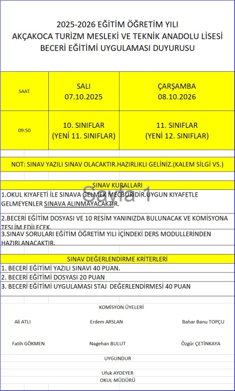 İşletmelerde Beceri Eğitimi sınavlarınız 7 ekim ve 8 ekim 2025 tarihlerinde alan öğrencilerine yönelik yapılacaktır.